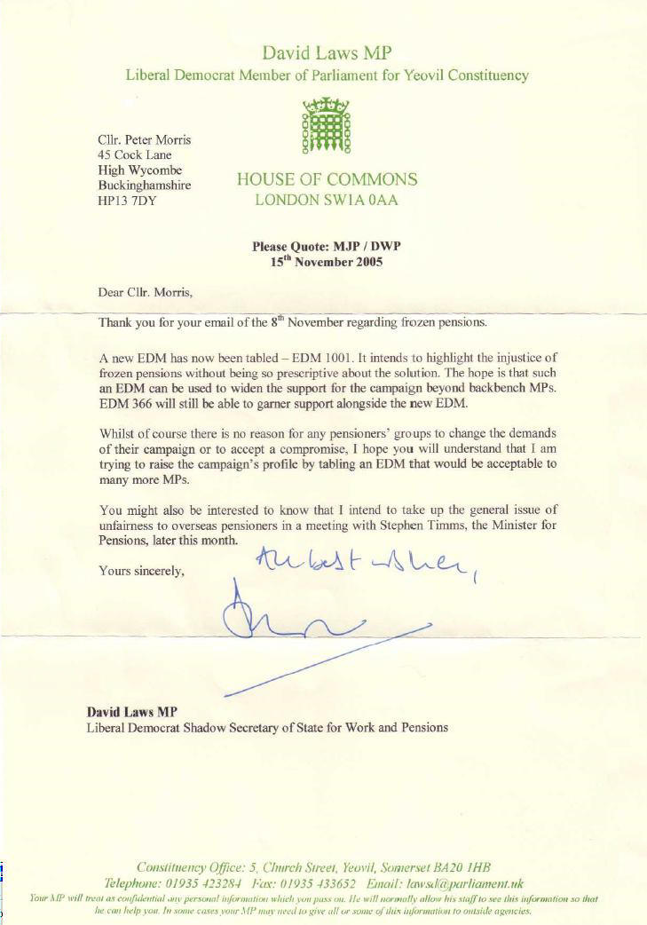Text of letter from David Laws MP Thank you for your email of the 8th November regarding frozen pensions. A new EDM has now been tabled - EDM 1001, It intends to highlight the injustice of frozen pensions without being so prescriptive about the solution. The hope is that such an EDM can be used to widen the support for the campaign beyond backbench MPs, EDM 366 will still be able to garner support alongside the new EDM. Whilst of course there is no reason for any pensioners' groups to change the demands of their campaign or to accept a compromise, I hope you will understand that I am trying to raise the campaign's profile by tabling an EDM that would be acceptable to many more MPs. You might also be interested to know that I intend to take up the general issue of unfairness to overseas pensioners in a meeting with Stephen Timms, the Minister for Pensions, later this month. Yours sincerely Hand signed |